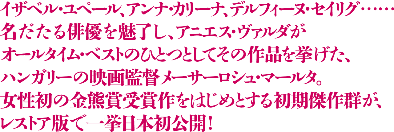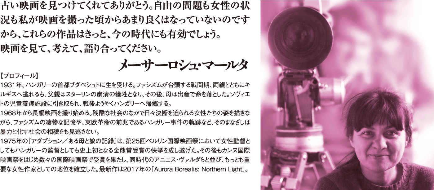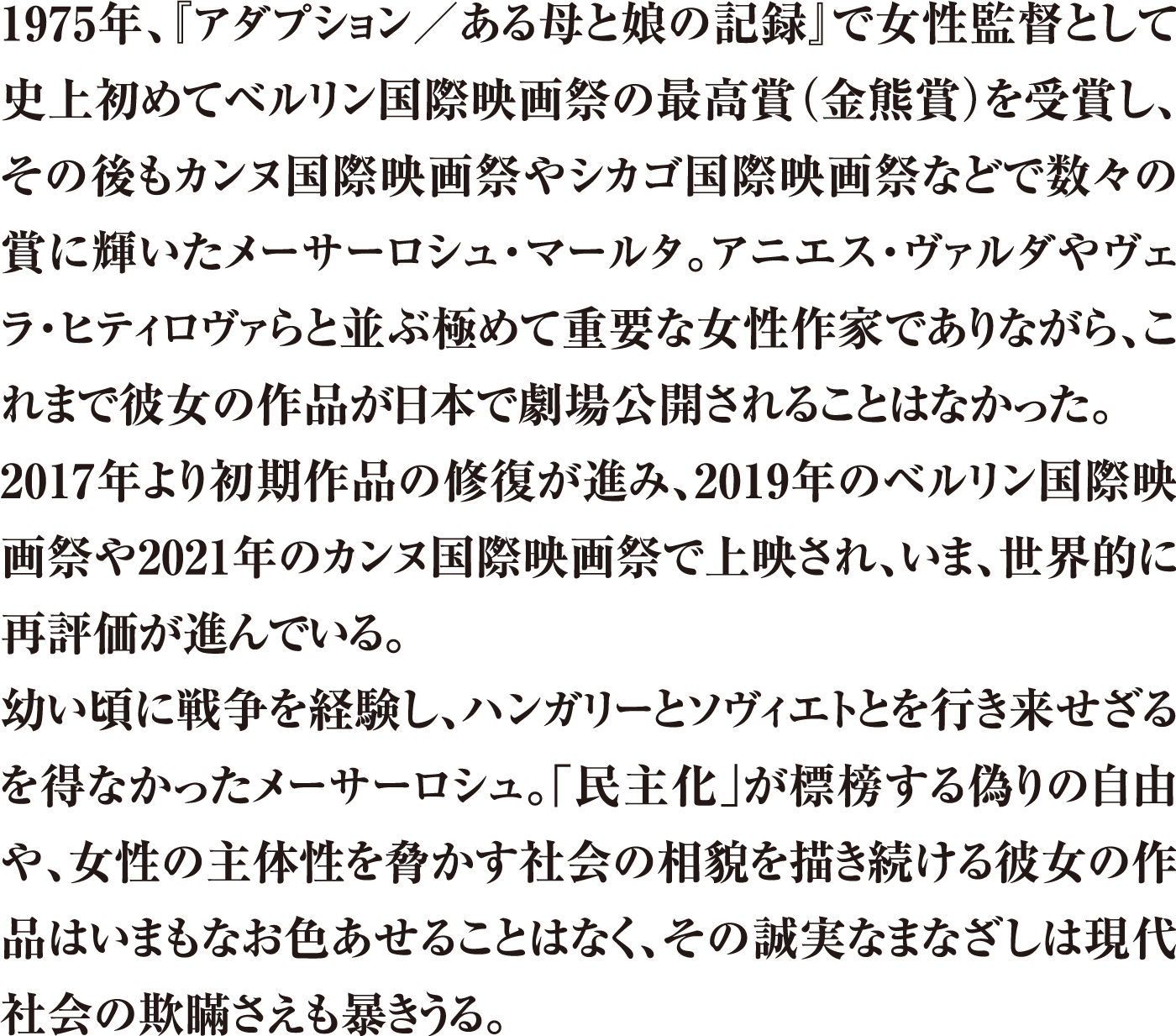 メーサーロシュ・マールタは1968年より長編映画を撮り始める。実のところ、まさにデビュー作“The Girl”において彼女の特徴的な主題——孤児であること、親子の関係、女性によるアイデンティティの模索、愛への飢え、孤独——を見出すことができる。主演はハンガリーの有名な歌手、コヴァーチュ・カティ。監督が彼女を起用した理由は、その力強さと特異な個性である。1970年以降の諸作は、こうした自我と闘争をいとわない強さを兼ね備え、本能的に行動を起こす女性キャラクターによって特徴づけられる(ベレク・カティ [訳注:『アダプション/ある母と娘の記録』カタ役など] 、モノリ・リリ [訳注:『ナイン・マンス』ユリ役など] )。我々は彼女たちの視点を通して、社会的環境や60年代から70年代におけるライフスタイルの変化、そして若い労働者や知識人たちが抱える諸問題を目の当たりにする。メーサーロシュは“Riddance”、『アダプション/ある母と娘の記録』、『ナイン・マンス』そして『マリとユリ』において、明確かつ非偏向的、さらにドキュメンタリー的ともいえる厳格な手法で、主人公たちの運命を描き切っている。これらの作品はすぐさま国際的な評価を得、『アダプション/ある母と娘の記録』は1975年のベルリン国際映画祭で金熊賞を受賞した。そして『ナイン・マンス』は1977年のベルリンにてOCIC賞を、カンヌにてFIPRESCI賞を受賞し、これをきっかけに外資による共同製作の道が開けた。これらの作品は大スターを起用してもいる。『マリとユリ』には彼女のパートナーでもあるヤン・ノヴィツキのほか、マリナ・ヴラディとヴラジーミル・ヴィソツキーらが出演。『ふたりの女、ひとつの宿命』にはイザベル・ユペールが出演している。ゴーモン社との共同製作作品『ふたりの女、ひとつの宿命』は、驚くべき三角関係を通して歴史的背景を描いた初めての映画である。同様の女性的視座を備えた「日記」四部作では、1956年のハンガリー事件に起因する実力行使が起こるまでの、メーサーロシュの個人的記憶が辿られる。同シリーズの一作目“Diary for My Children”は1984年のカンヌで審査員賞に輝いた。