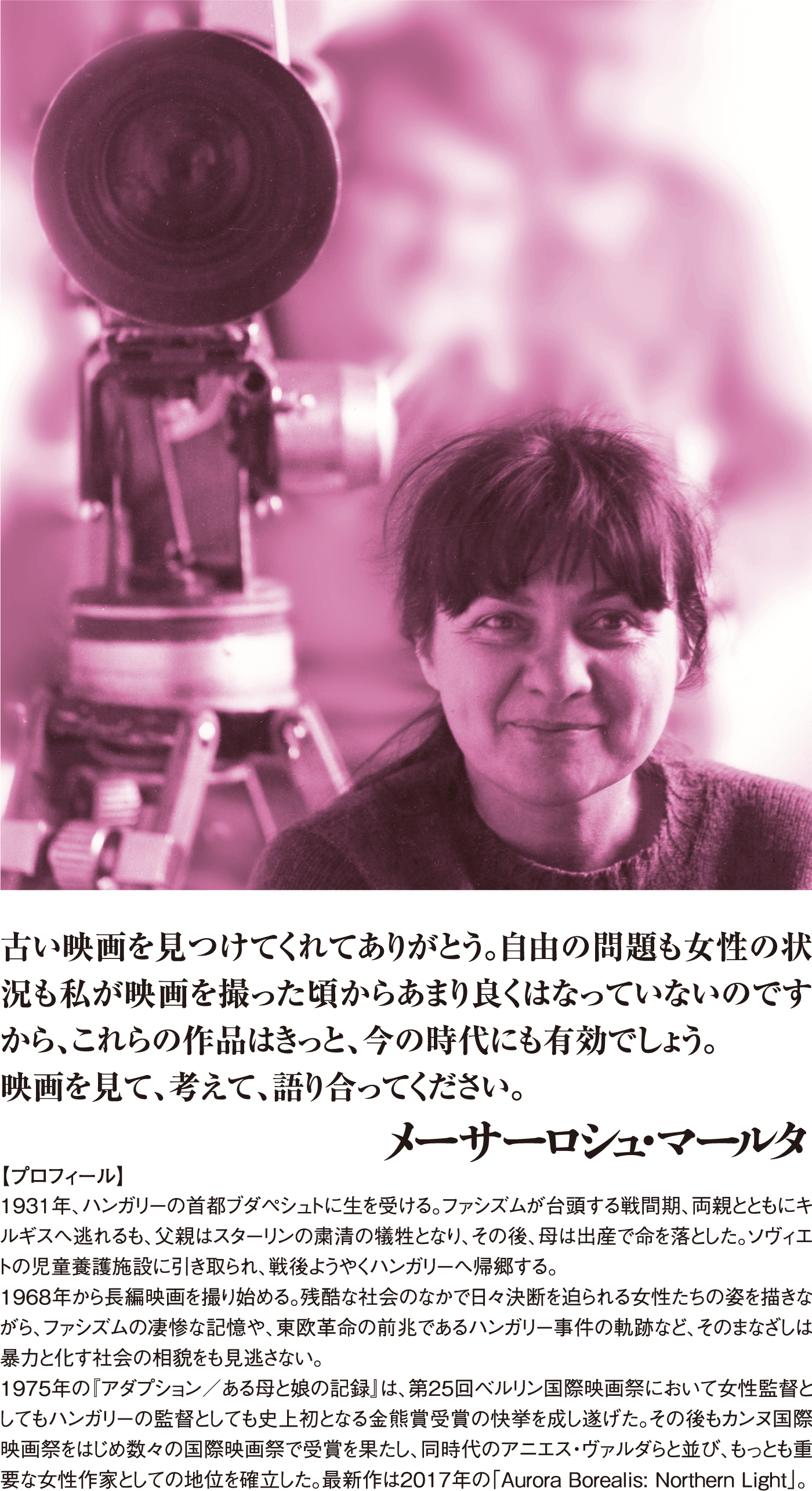 メーサーロシュ・マールタは、ハンガリーはもとより全世界の映画史においても唯一無二の地位を獲得している。コシュート賞やプリーマ・プリミッシマ賞の受賞者であり、ベルリン、シカゴ、カンヌ、その他多くの国際映画祭において受賞歴のあるこの監督は、まさしく歴史上の重要人物だ。同時代のアニエス・ヴァルダやラリーサ・シェピチコ、ヴェラ・ヒティロヴァらと並ぶ、世界でもっとも重要な女性作家のひとりである。彼女はハンガリー人女性として初めて映画監督の分野で学位を与えられた人物であり、監督デビュー作は世界中の注目を集めた。いまもなお女性の人生(アイデンティティ、逸脱、女性の反抗、性愛、スターリニズム下のハンガリー史)を描き続けている。