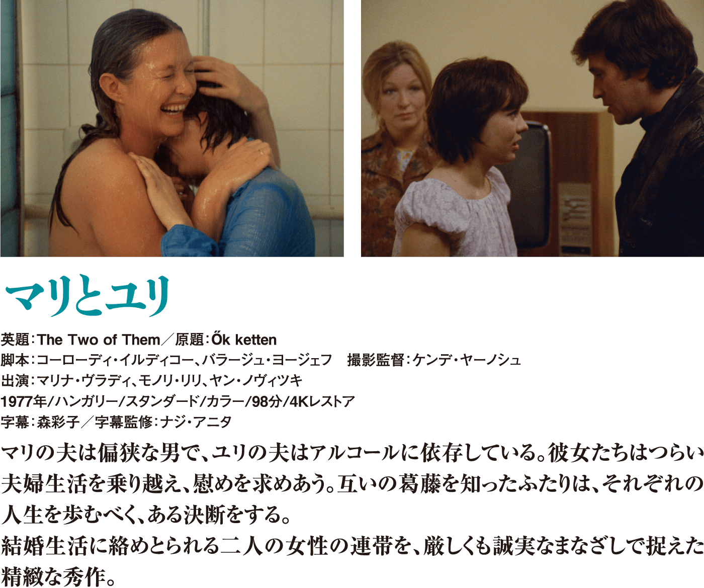 背景を遠ざけたクローズアップが許されぬ愛から結婚そして養子縁組へと二人の女の心と身体の揺れ動きをひたすら追いかけるゴダール映画の常連だったサボー・ラースローの本国出演作としても貴重!
